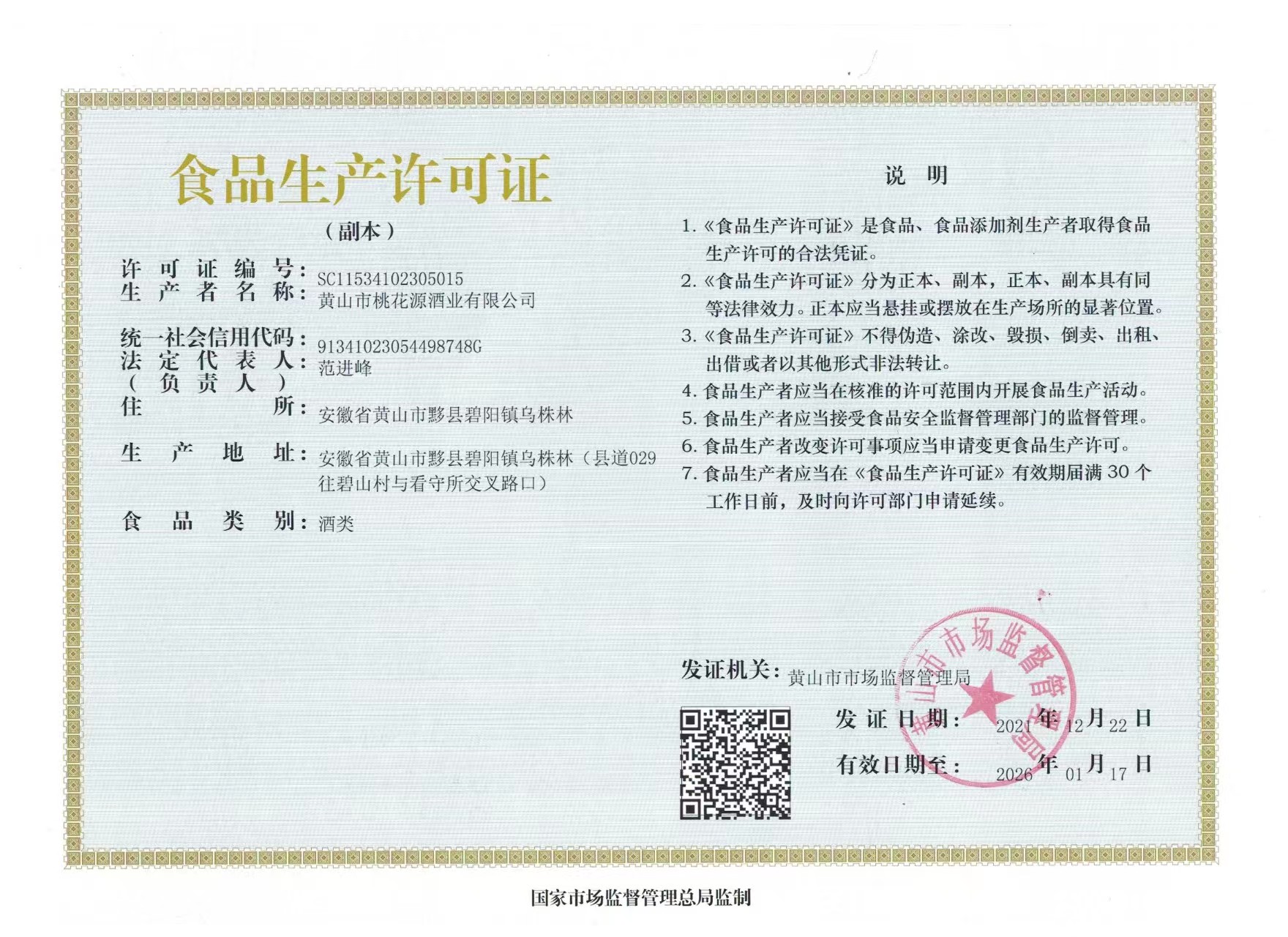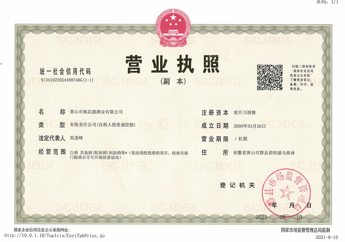 生產(chǎn)商:黃山市桃花源酒業(yè)有限公司 生產(chǎn)地址:黃山市黟縣碧陽(yáng)鎮(zhèn)烏株林 質(zhì)量標(biāo)準(zhǔn)合格文件